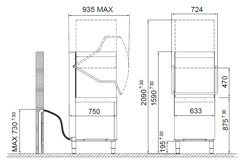 peristáltico de detergente, cuenta con una construcción completa de doble pared en la base y una capota de doble pared. La cuba incorpora un fondo soldado y está equipada con un filtro de superficie en material compuesto. El soporte para cestas se apoya directamente en el borde de la cuba.