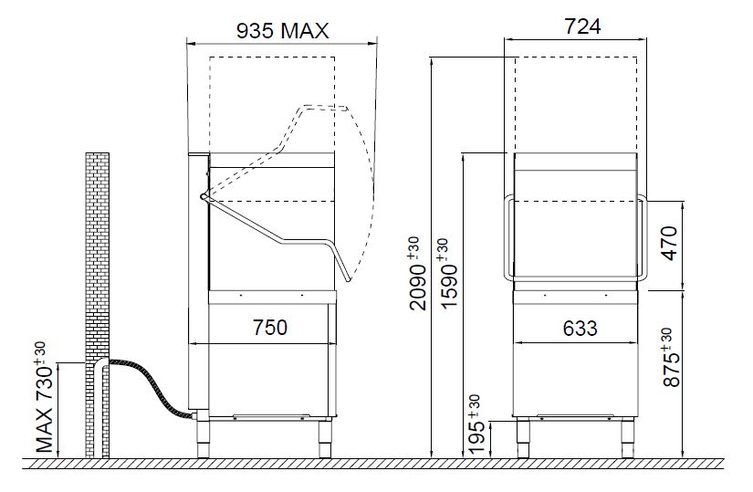 Lavavajillas de capota COLGED TopTech 48-33 D con cesta 50×50, con desagüe parcial con bomba, caldera atmosférica con bomba de aclarado y dosificador peristáltico de detergente, cuenta con una estructura de doble pared en la base y una capota de doble pared. La cuba embutida está equipada con un filtro de superficie en acero inoxidable y un soporte de cestas abatible.