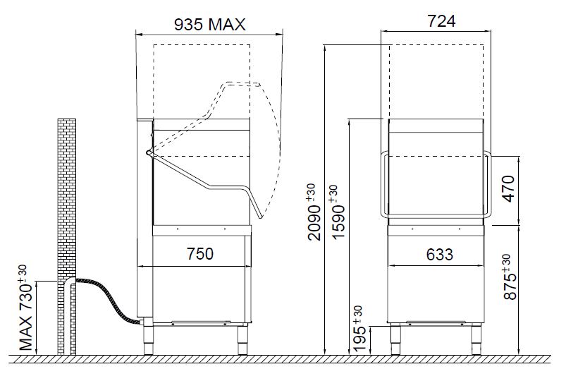 bomba, caldera atmosférica con bomba de aclarado y dosificador peristáltico de detergente, cuenta con una estructura de doble pared en la base y una capota de doble pared, y está equipado con aislamiento ProTect: paneles especiales fonoabsorbentes y termoaislantes que reducen la dispersión térmica y el consumo en modo de espera, en cumplimiento con la norma EN 63136:2019. La cuba embutida está equipada con un filtro de superficie completa en acero inoxidable y un soporte de cestas abatible.