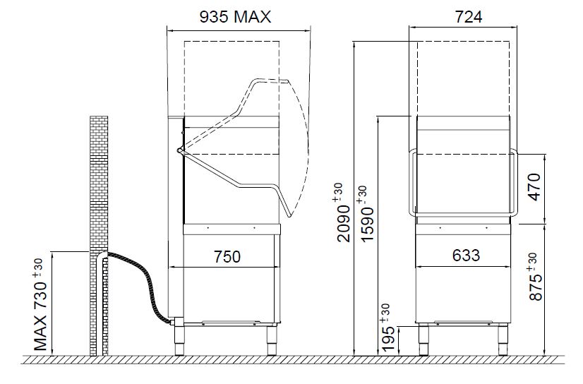 Lavavajillas de capota COLGED UltraTech 48-33 DL con cesta 50×50, con ProLift, elevación automática de la capota, recuperación de calor del agua de desagüe, desagüe parcial con bomba, caldera atmosférica con bomba de aclarado y dosificador peristáltico de detergente, cuenta con una estructura de doble pared en la base y una capota de doble pared, y está equipado con aislamiento ProTect: paneles especiales fonoabsorbentes y termoaislantes que reducen la dispersión térmica y el consumo en modo de espera, en cumplimiento con la norma EN 63136:2019. La cuba embutida está equipada con un filtro de superficie completa en acero inoxidable y un soporte de cestas abatible.